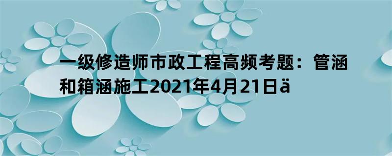 【摘要】2021年一级修造师考察工夫是9月11日至12日,还剩下5个月的温习工夫,那么报考2021年一级修造师考察,一级修造师市政工程高频考题:管涵和箱涵施工温习市政工程科宗旨注重心该当放正在哪里呢?举世网校一级修造师频道为您整顿揭晓一级修造师市政工程高频考题,指望对您温习有帮帮。